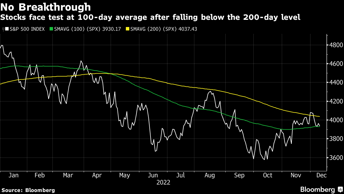 Cyclical stocks led the S&P 500 to a 3.4% drop in the week after the equity benchmark failed to hold above its average price for the past 200 days. While optimism that the Fed would slow the pace of rate increases had stoked a 14% rally since mid-October, investor moods have now darkened with worries that such a move, when it does come, will be the mark of an economy laid low.