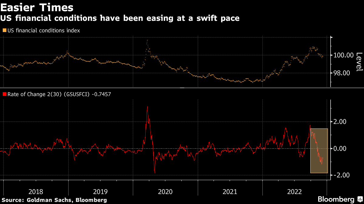 What complicates things further is that the November's equity rally has triggered the fastest easing in financial conditions since March 2020, according to a Goldman Sachs Group Inc. gauge, casting doubts on the Fed's ability to switch to looser policy starting next year.