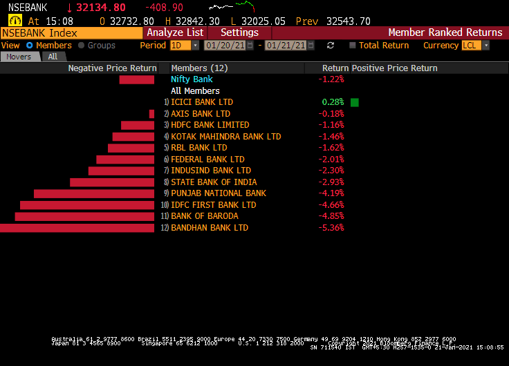 All sectoral indices ended lower with the PSU Bank index ending as the top laggard with losses of 3.3%. The Nifty Bank index too fell 350 points or 1.1% to end at 32,186.