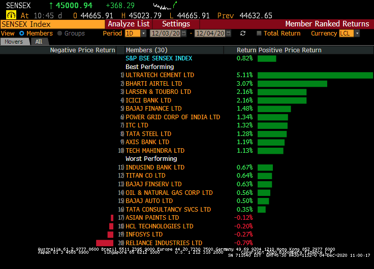 The S&P BSE Sensex opened 50 points higher at 44,665 while the NSE Nifty 50 index gained 0.5% at the start of trade to open at 13,177. As of closing on Thursday, both Sensex and Nifty were up over 1% for the week.