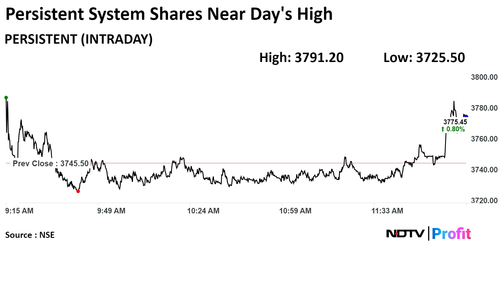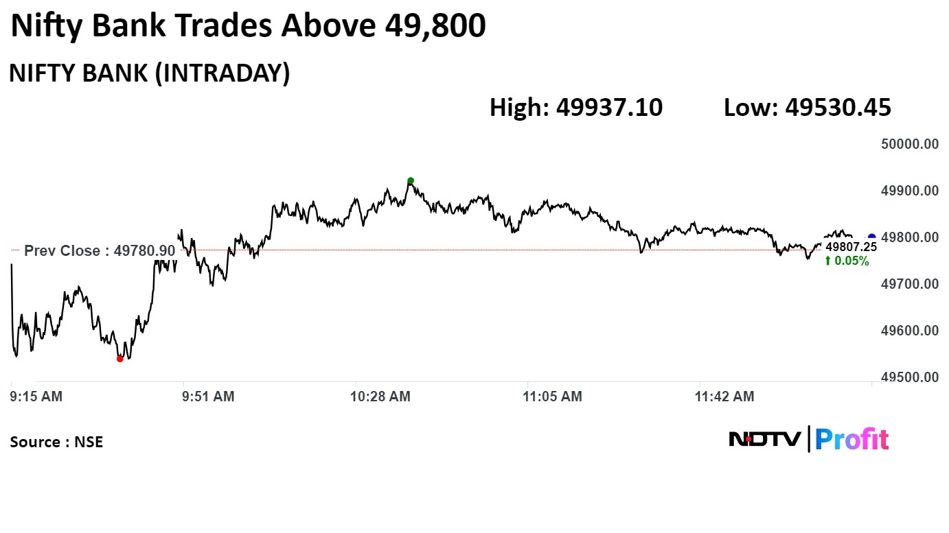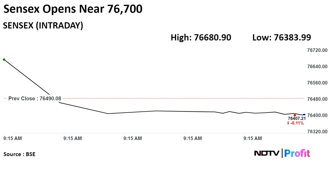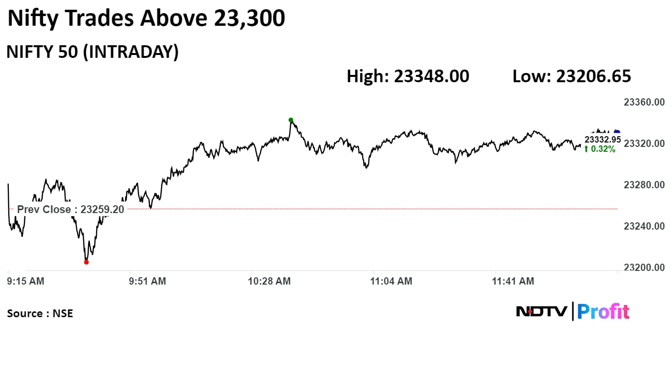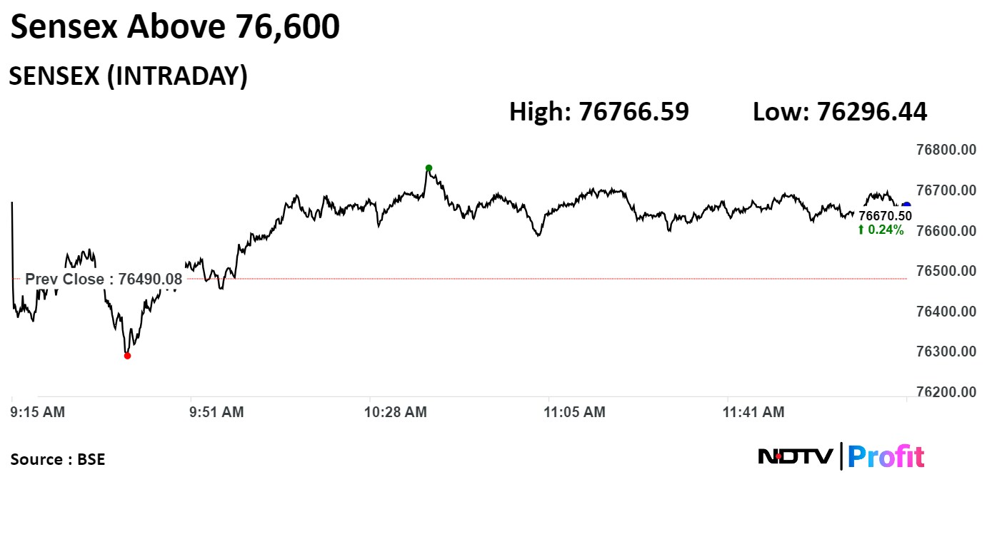 As of 12:19 p.m., the NSE Nifty 50 was 75.50 points or 0.32% higher at 23,334.70, and the S&P BSE Sensex gained 178.78 points or 0.23% to trade at 76,668.86.