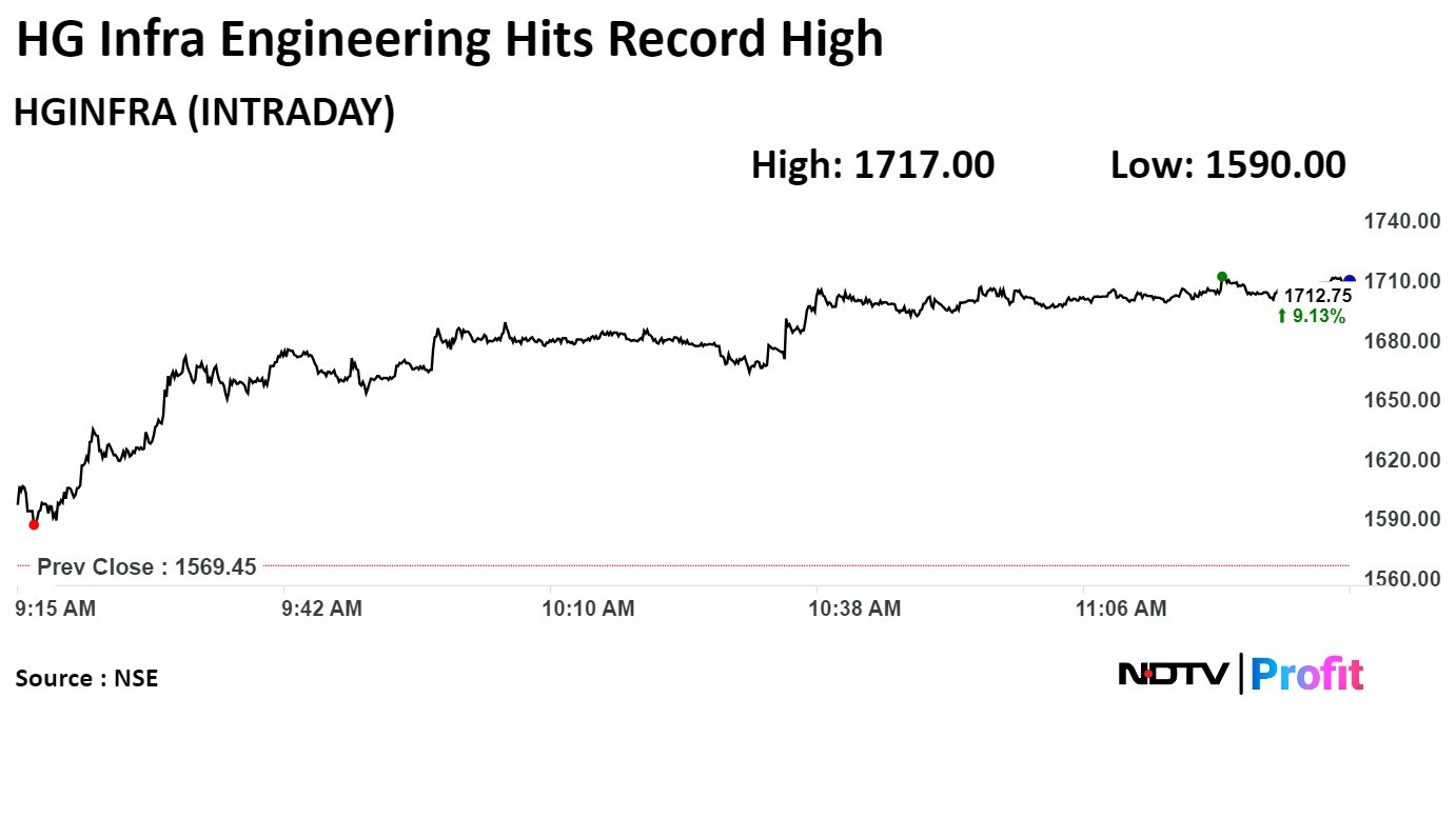Shares of H.G. Infra Engineering Ltd. surged 9.40% to Rs 1,717.00, the highest level since listing on March 9, 2018.