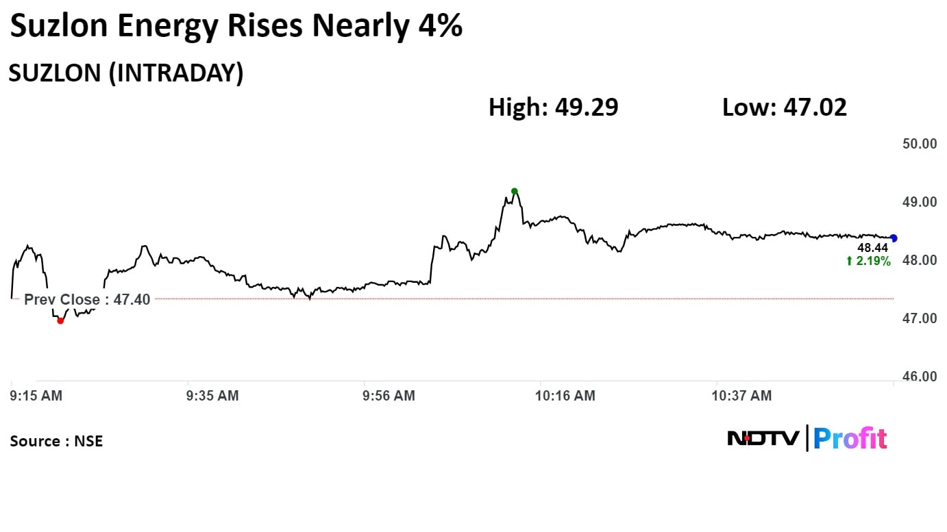 Shares of Suzlon Energy rose 3.99% to Rs 49.29, the highest level since June 5. It was trading 2.24% higher at Rs 48.46 as of 10:56 a.m., as compared to 0.29% advance in the NSE Nifty 50 index.