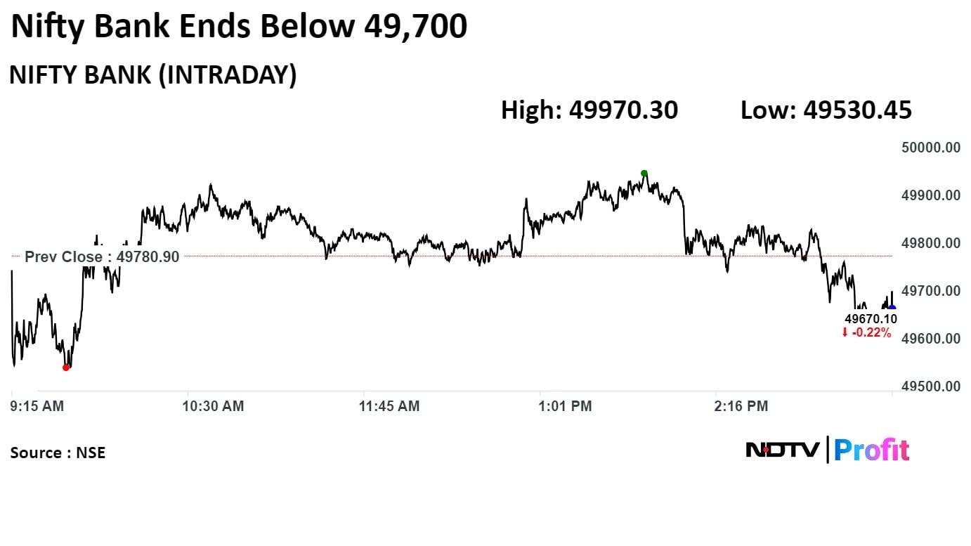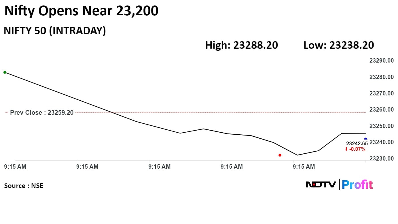 The Nifty 50 declined 0.23% to touch an intraday low of 23,206.65, and the Sensex fell 0.25% to hit a low of 76,296.44.