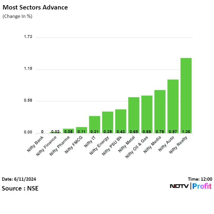 On NSE, 10 sectors advanced and two remained flat. The NSE Nifty Realty rose the most among peers, and the NSE Nifty Bank was the top loser on Tuesday.