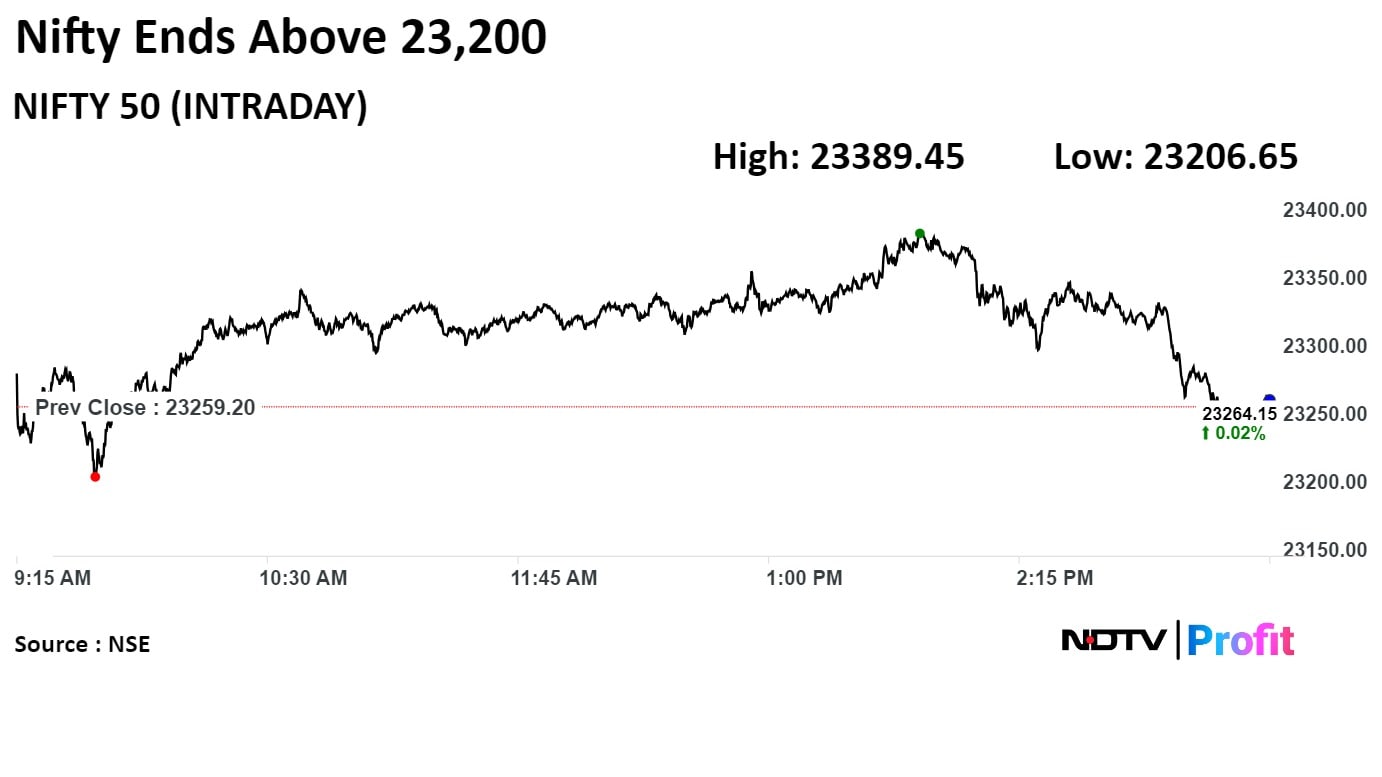 The Nifty ended at 23,264.85, up by 5.65 points or 0.02% and the Sensex closed lower by 33.48 points or 0.04% at 76,456.59. Intraday, the Nifty gained as much as 0.56% and the Sensex gained 0.48%.