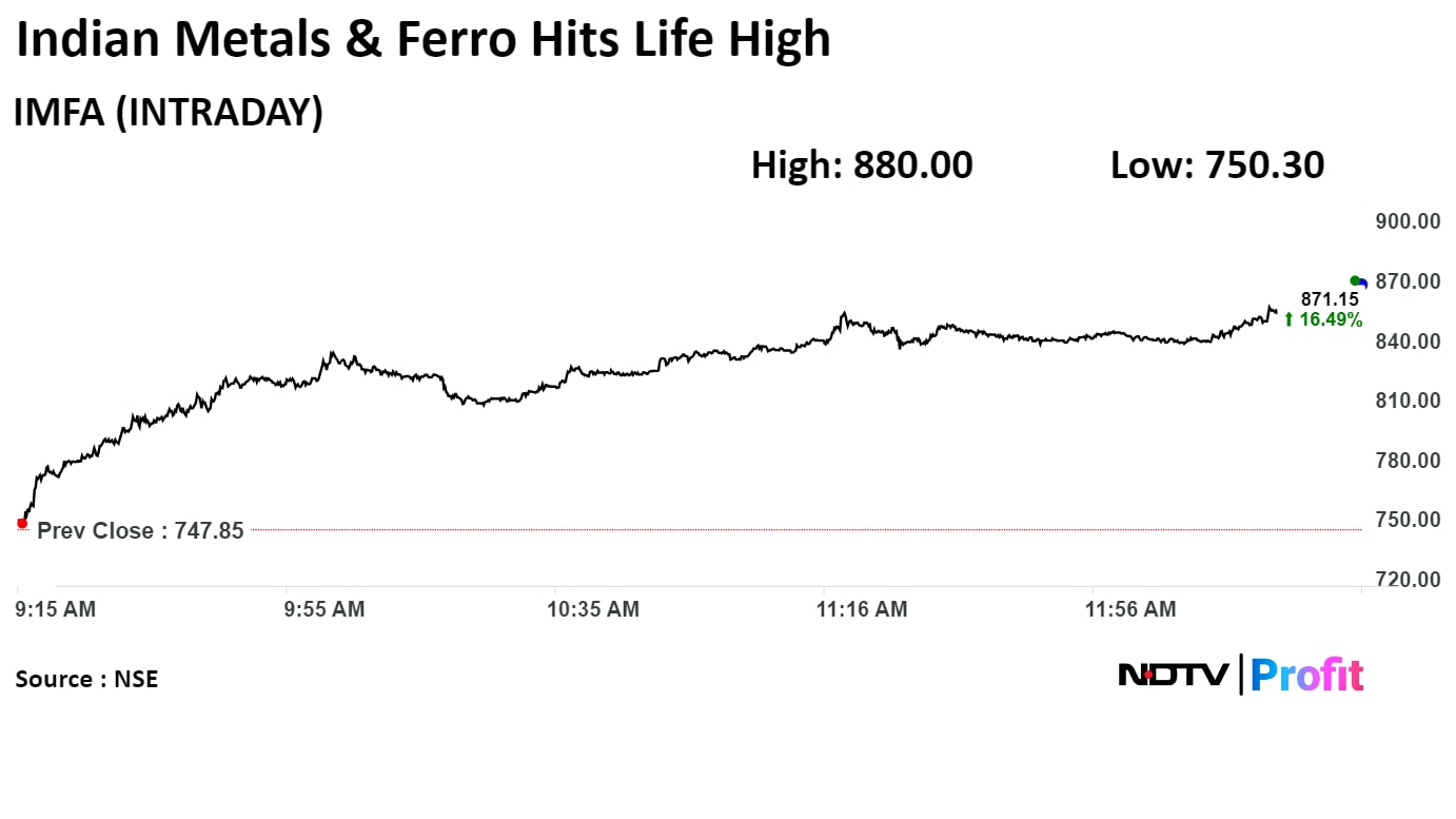 Shares of Indian Metals & Ferro Alloys Ltd. jumped 17.67% to Rs 880.00, the highest level since its listing on Jul 23, 2010. It was trading 16.28% higher at Rs 869.60 as compared to 0.29% advance.