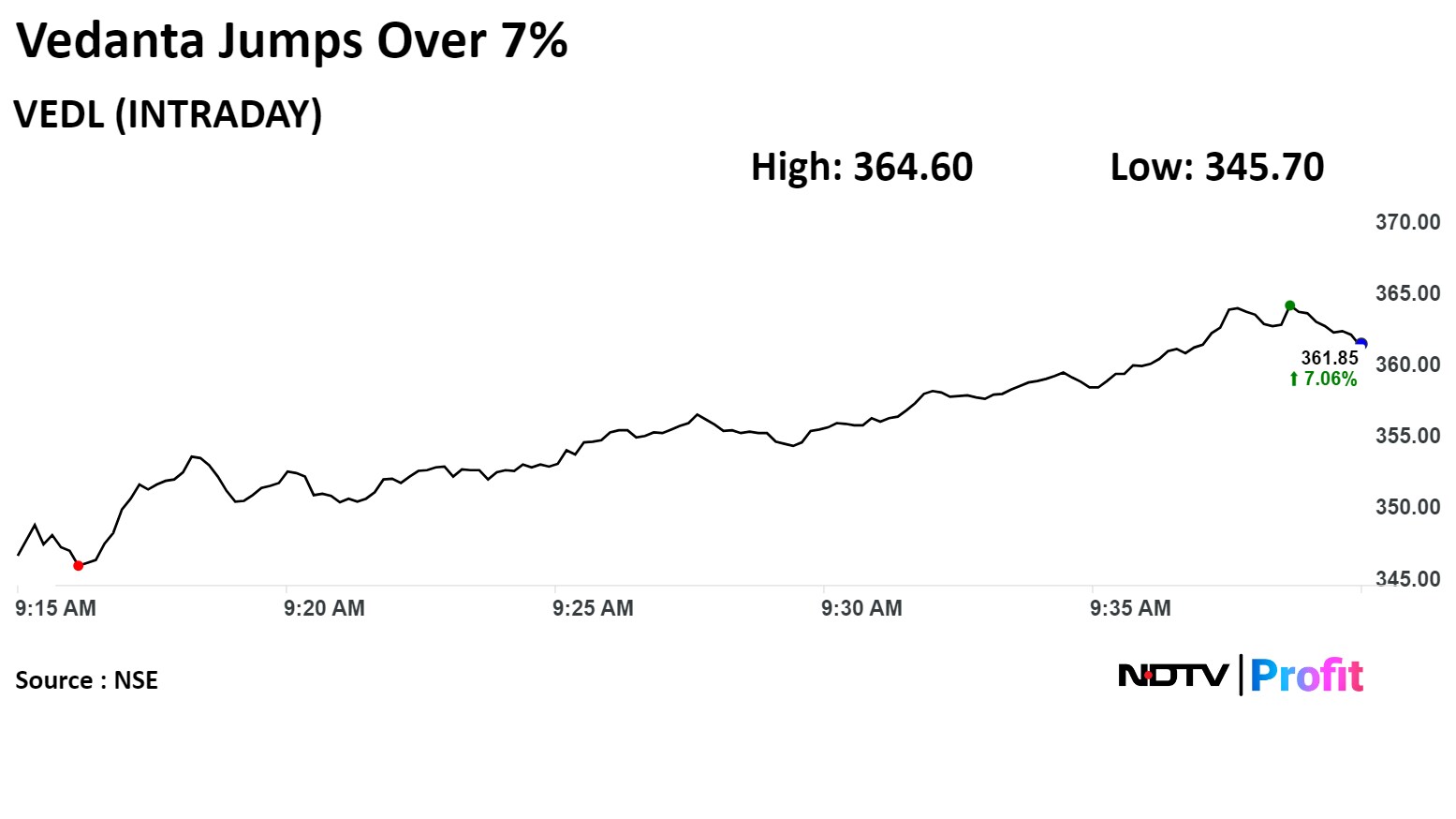 Vedanta's stock rose as much as 7.06% — the highest jump since Sept. 29. — during the day to Rs 361.85 apiece on the NSE. It was trading 6.94% higher at Rs 361.45 per share, compared to a 0.33% advance in the benchmark Nifty as of 9:40 a.m.