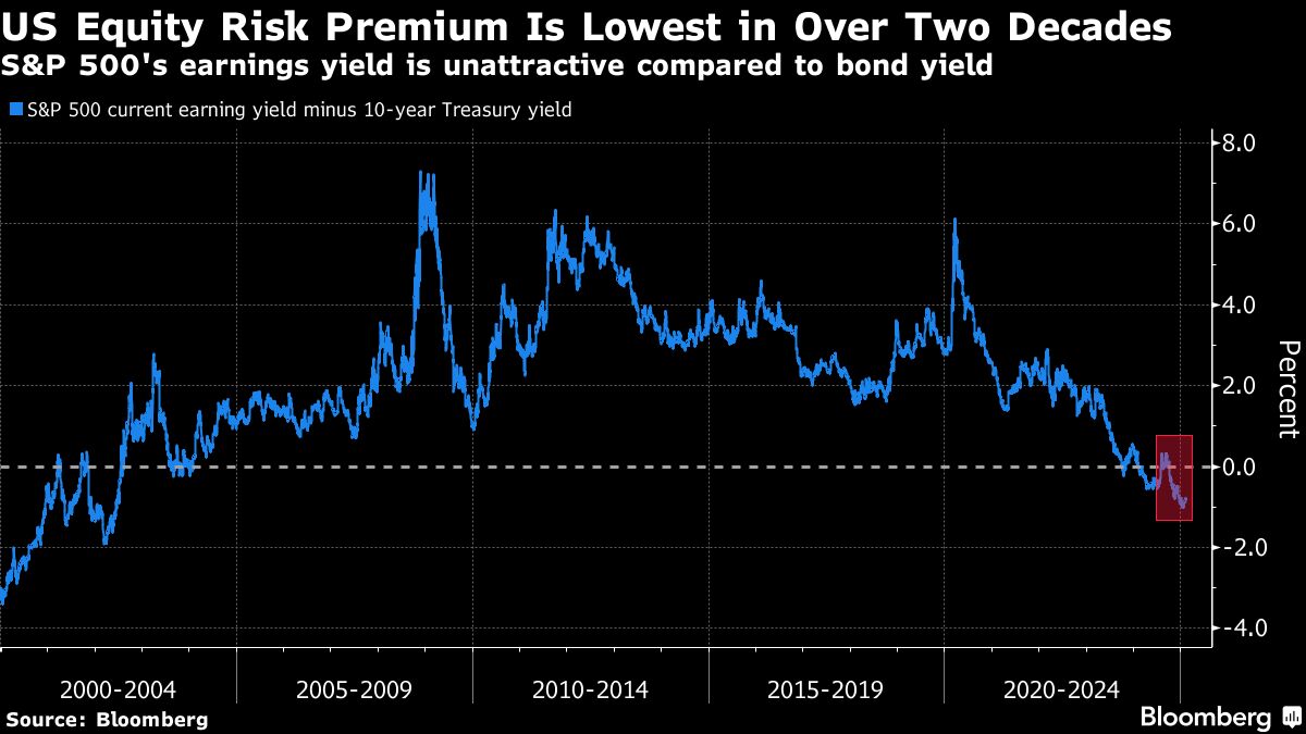 Positioning tells a similar story. The US equity risk premium (ERP) — a measure of the differential between the expected returns of stocks and bonds — is deep into negative territory, something that hasn't happened since the early 2000s. Whether that's a negative indicator for share prices depends on the economic cycle. A lower number can be seen as indicating that corporate profits are going to rise. Or it could mean that stocks are climbing too rapidly and are far above their actual value.