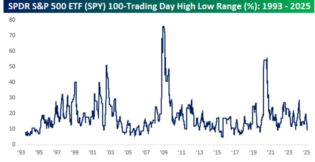 Over the last 100 trading days, the roughly $630 billion exchange-traded fund tracking the S&P 500 (SPY) has traded in a relatively narrow range of less than 10%, according to Bespoke. While that may sound like a wide range, it ranks in just the 13th percentile of all comparable periods dating back to SPY's inception in 1993. Back in Covid, this reading spiked above 50% and during the Financial Crisis, it widened even more, peaking above 75%.