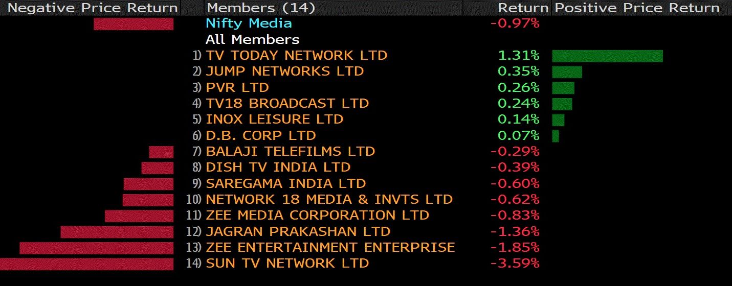 Most media shares declined in today's trade, led by the fall in Sun TV Network Ltd. and Zee Entertainment Enterprises Ltd.
