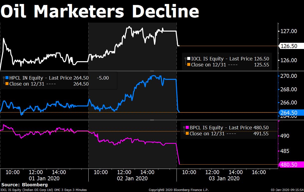 Shares of oil marketing companies—Indian Oil Corporation Ltd., Bharat Petroleum Corporation Ltd. and Hindustan Petroleum Corporation Ltd.—declined after crude oil price spiked due to the flare-up in U.S.-Iran tensions.