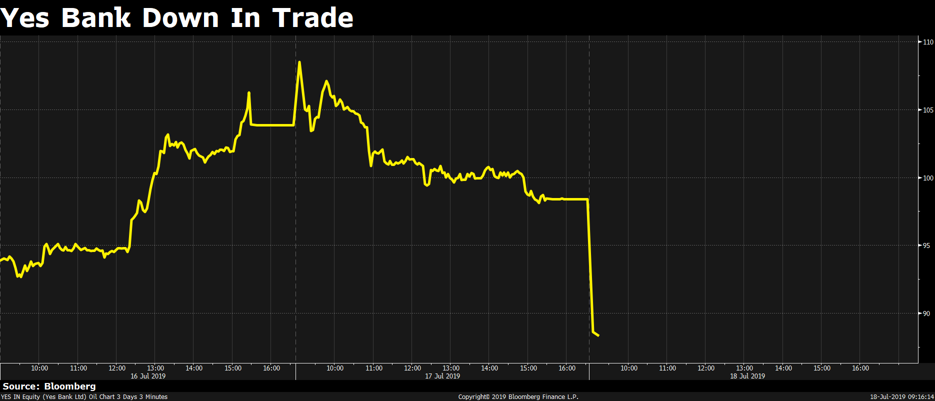 Shares of Yes Bank Ltd. fell 19.56 percent to Rs 79.15, their lowest level since March 2014, after its profit fell 91 percent year-on-year to Rs 114 crore in the June quarter as Chief Executive Ravneet Gill undertook a large-scale bad loan clean-up exercise.