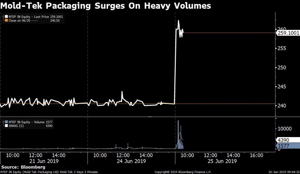 Shares of Mold-Tek Packaging Ltd. rose as much as 11.8 percent, the most since Feb. 21, to Rs 268.70 apiece.