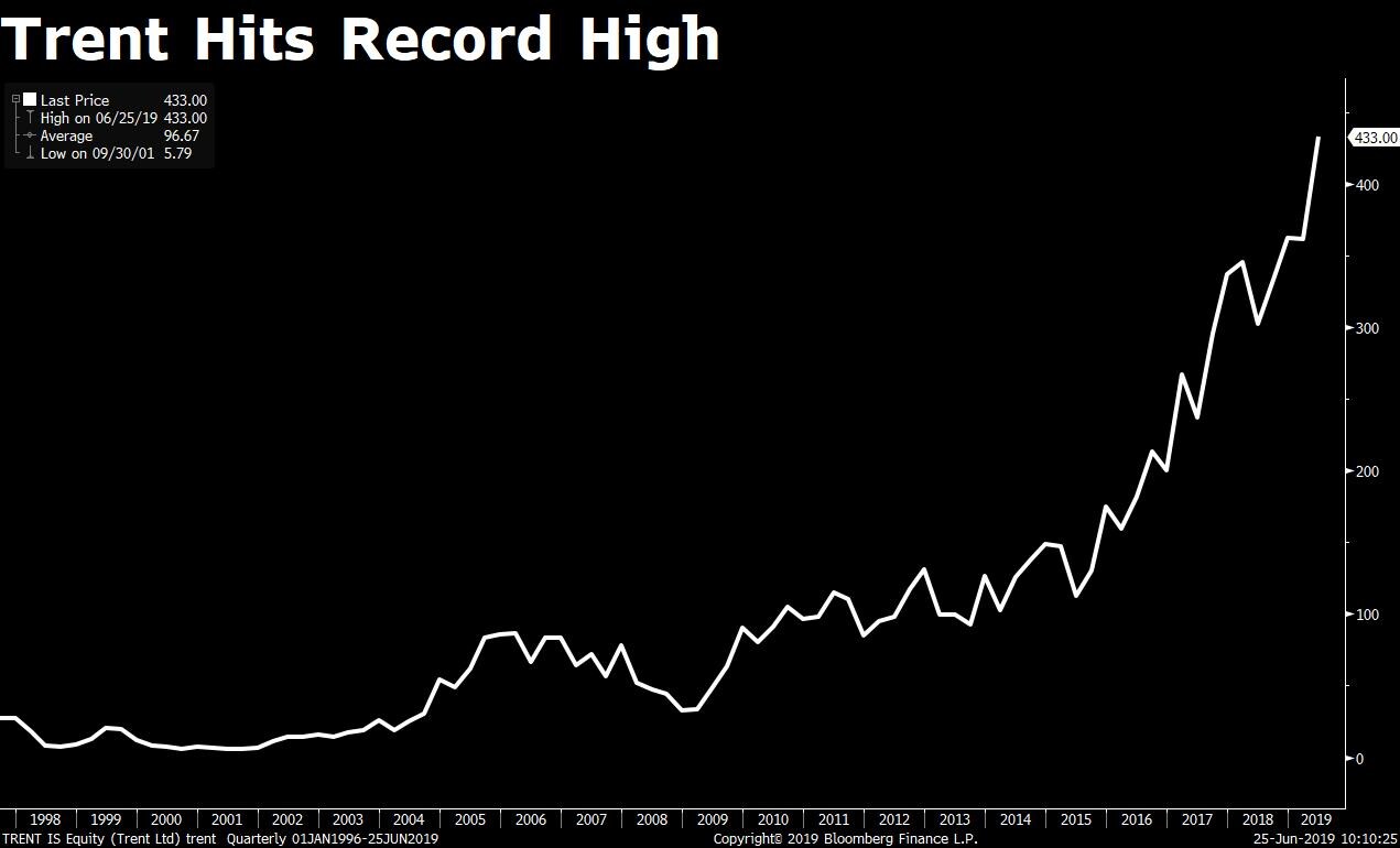 Shares of Tata Group retail arm Trent Ltd. gained for the second straight session. The stock rose as much as 2.6 percent to touch a record high of Rs 436.90 a share.
