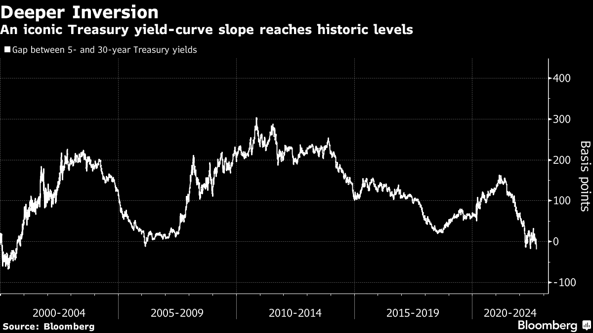 The continued rise in rate-sensitive Treasuries deepened the curve inversion, a harbinger for a looming recession. The curve from five to 30 years inverted by as much as 20 basis points in US trading Thursday, a day after the two- to 30-year spread also became the most negative in more than two decades. Mortgage rates in the US topped 6% for the first time in nearly 14 years.