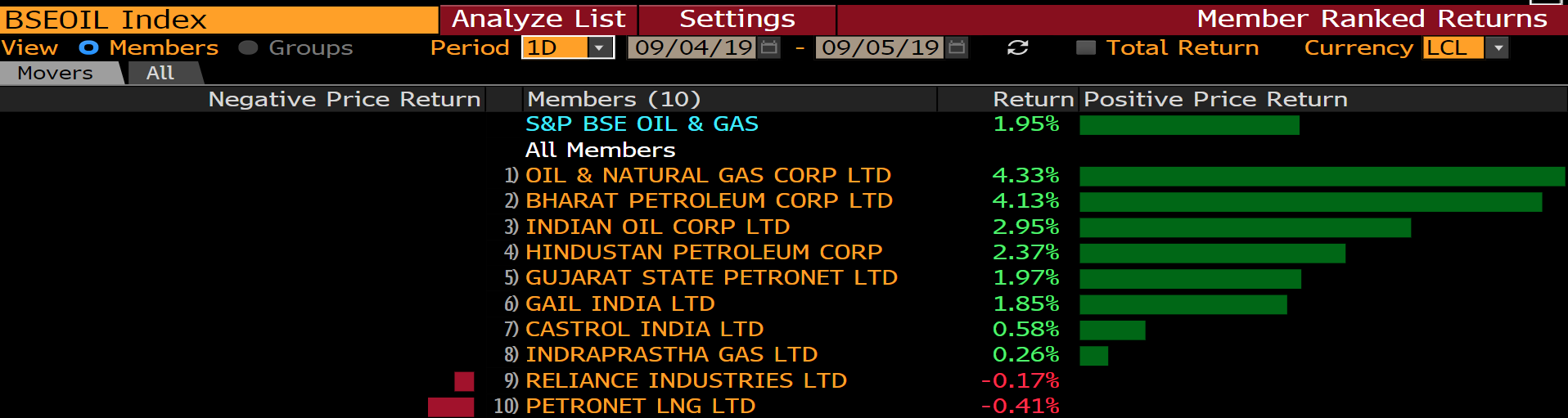 The oil explorer rose as much as 4.66 percent to Rs 124.6 apiece, followed by Bharat Petroleum Corporation Ltd. and Indian Oil Corporation Ltd. Petronet LNG was the biggest drag on the index, according to Bloomberg data.