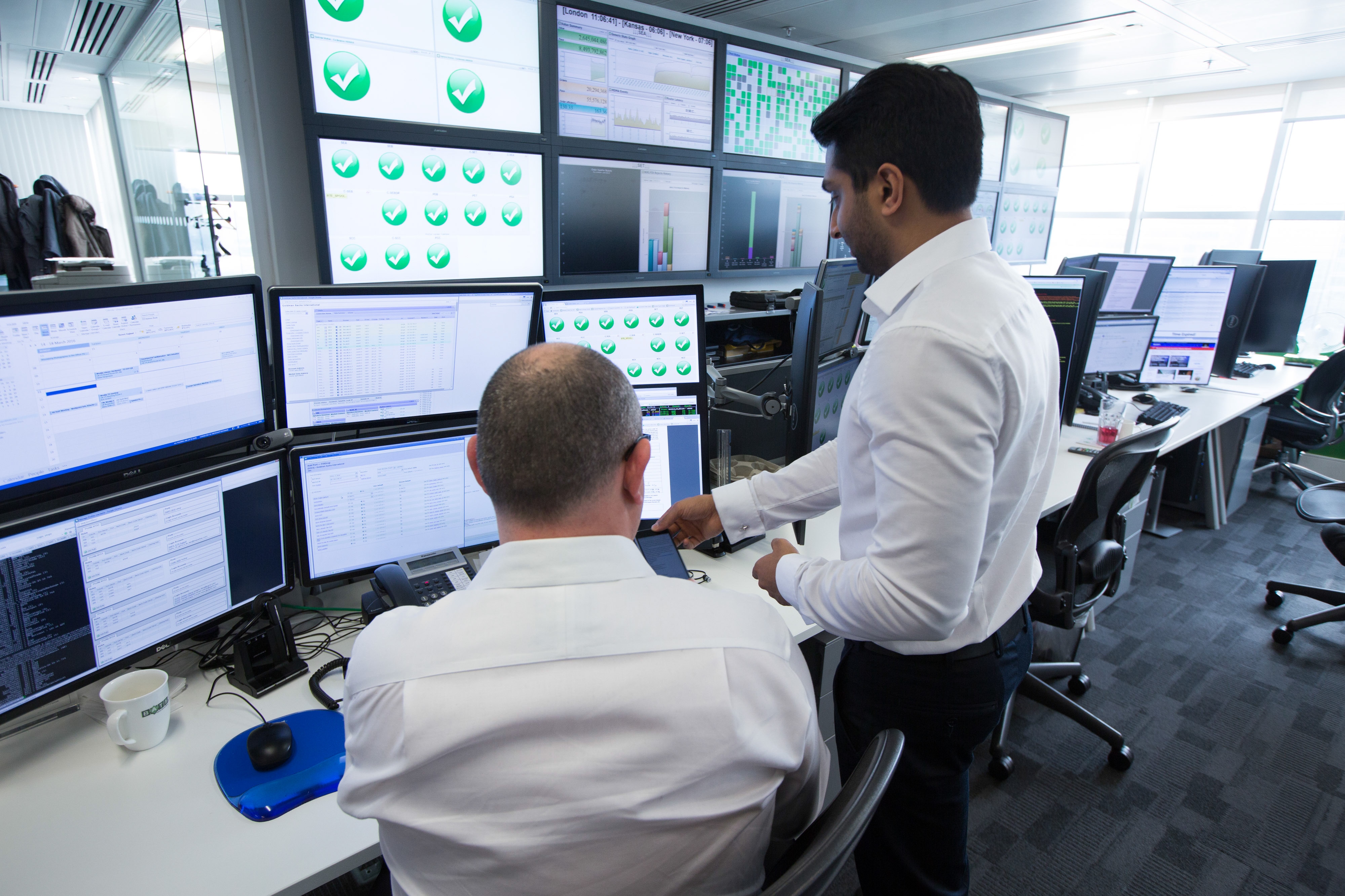 Exchange staff talk whilst examining financial data on computer screens on the trading floor. (Photographer: Jason Alden/Bloomberg)