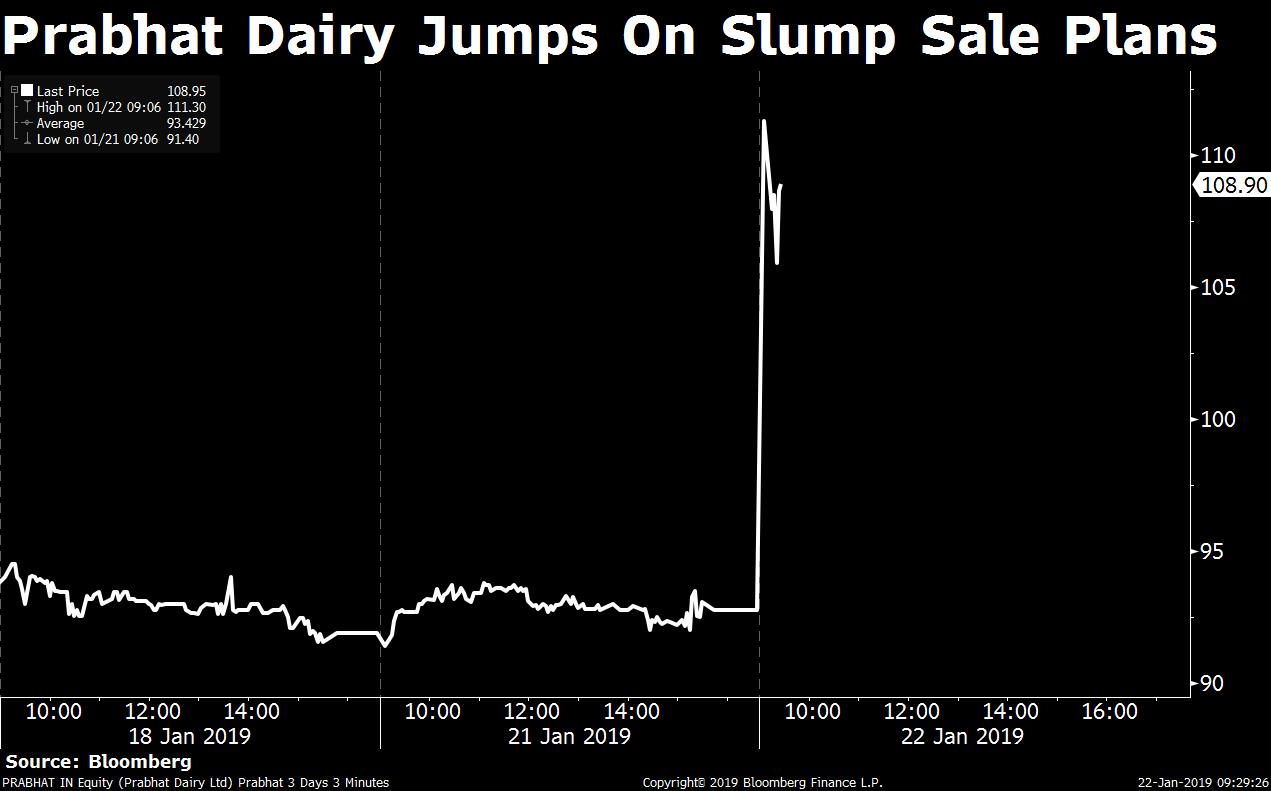 Shares of Prabhat Dairy rose as much as 20.4 percent, the most since August 2016, to Rs 111.65 apiece.