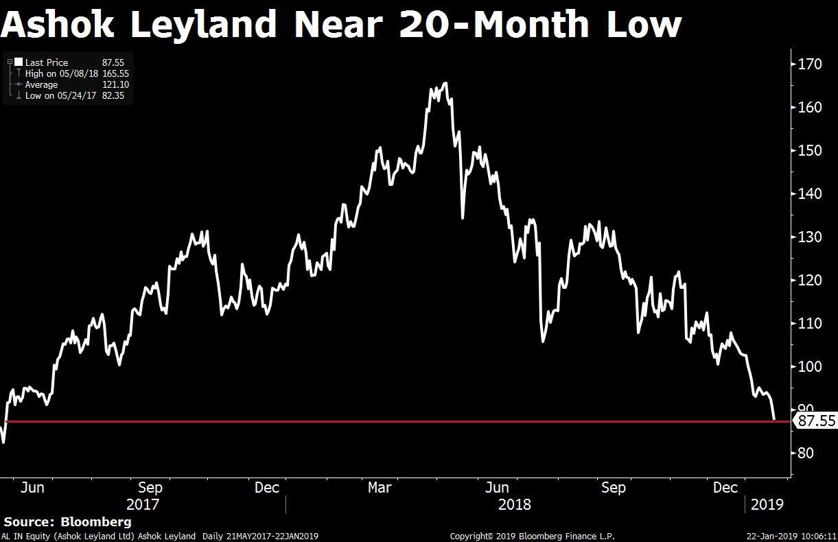 Shares of Ashok Leyland fell as much as 3.6 percent to trade at their lowest levels since May 2017.