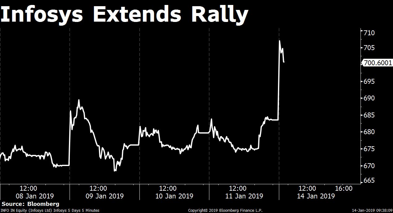 Shares of the software services exporter rose as much as 3.9 percent, the most since Nov. 28, to Rs 710.20 apiece.