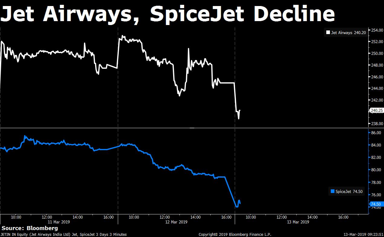 Shares of Jet Airways (India) Ltd. and SpiceJet Ltd. declined after the Directorate General of Civil Aviation grounded the Boeing 737 Max aircraft with immediate effect following the deadly Ethiopian Airlines plane crash.