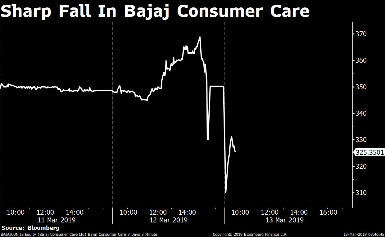Shares of Bajaj Consumer Care Ltd. fell as much as 12.1 percent, the most since November 2016, to Rs 307.80.
