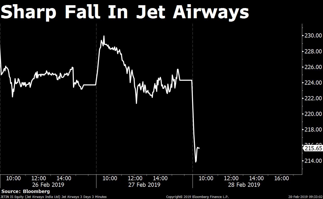 Shares of the Naresh Goyal-led carrier fell as much as 6.3 percent, its second-worst performance this month, to Rs 210.