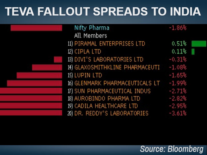 Drugmakers were the worst performing stocks both on the Sensex and the Nifty after Teva Pharmaceuticals Industries Ltd., the world's biggest maker of generic medicines, slashed its profit forecast for the second time this year.