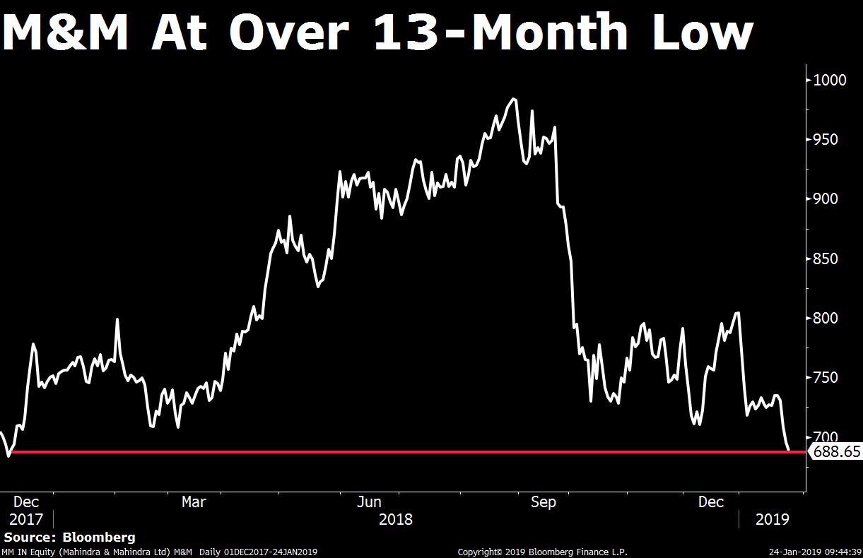 Shares of the Anand Mahindra-led company fell for the fourth session and are set for their longest losing streak in over a month. The stock fell as much as 1.4 percent to Rs 686.05, its lowest levels since December 2017.
