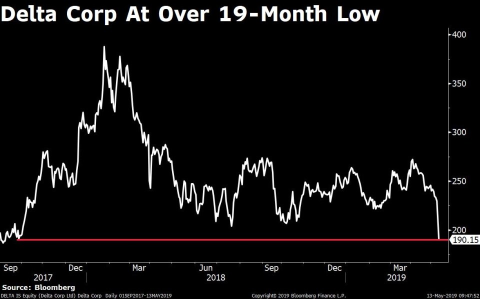 Shares of the casino operator declined 12 percent intraday to Rs 188.20 apiece.