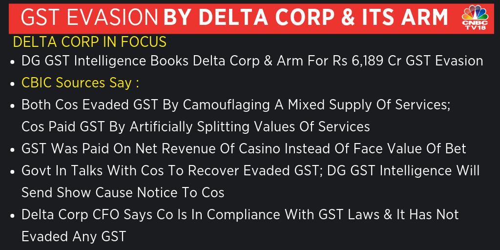 GST Intelligence has booked two Goa companies, including Delta Corp, for Rs 6,189 crore tax evasion, CNBC TV18 reported, citing unnamed sources. However, the company's CFO said the company was GST-compliant and hasn't evaded tax.