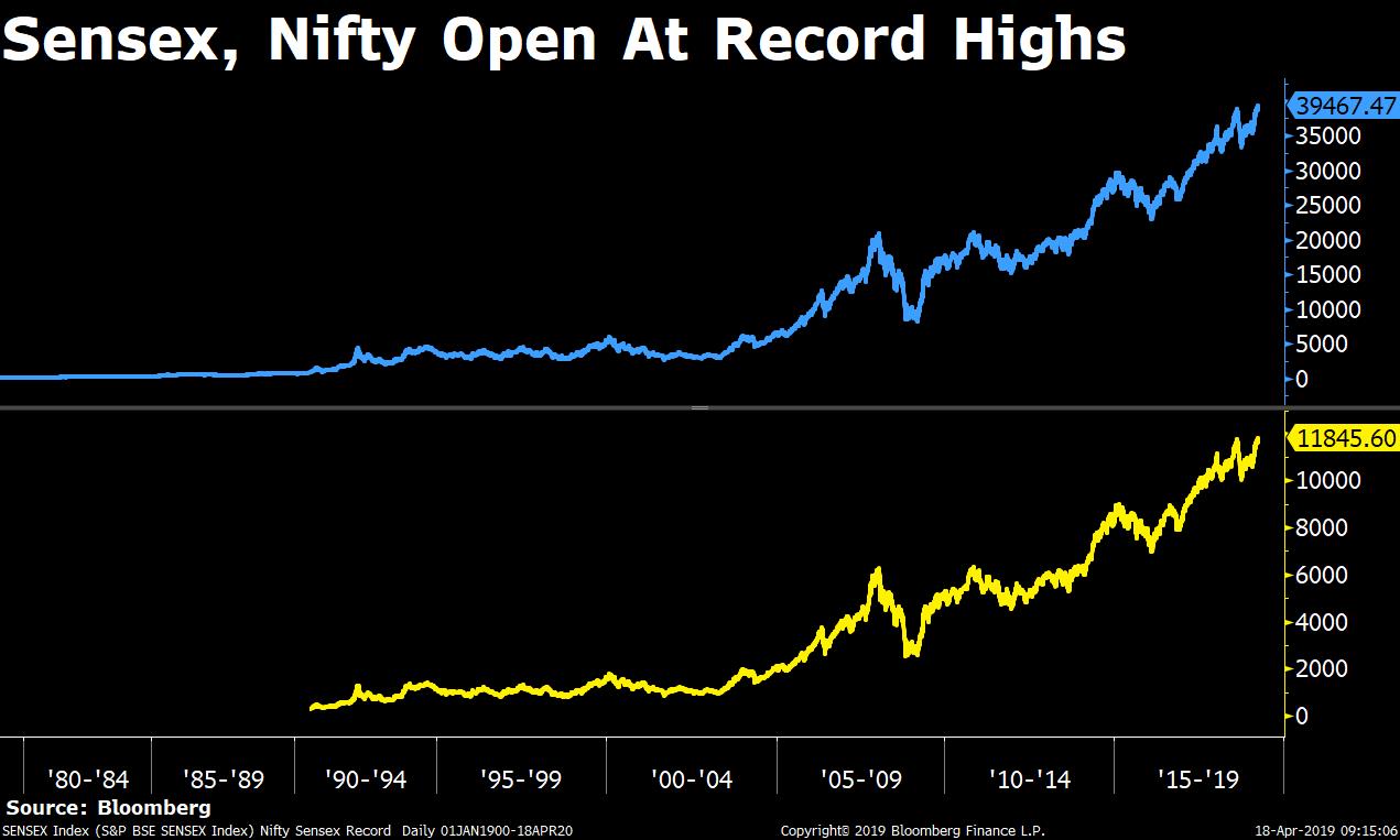 Indian equity benchmarks extended gains for the fourth consecutive trading session to open at record highs.