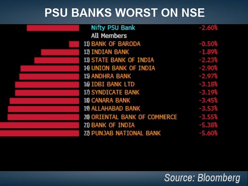 The gauge of PSU banks compiled by the NSE–Nifty PSU Bank Index–fell as much as 2.4 percent. Bank of India and Punjab National Bank were the biggest losers, falling over 5 percent each.