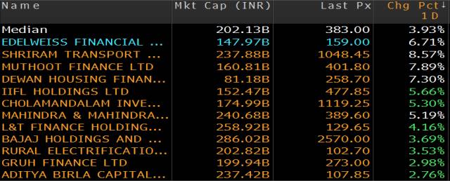 Stocks of finance companies, however, were trading higher. Muthoot Finance gained nearly 8 percent to Rs 401.80 apiece and Shriram Transport Finance rose as much as 8.6 percent to Rs 1,048.45 a share.