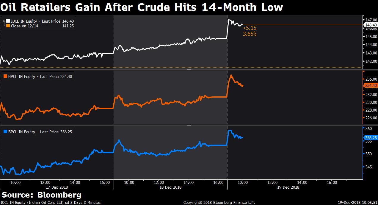 Shares of oil marketing companies rose after Brent crude fell to $56.26 per barrel, its lowest in over a year, in yesterday's trading session.