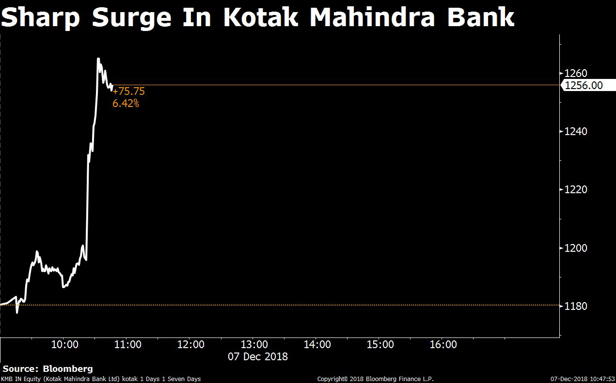 Shares of the Uday Kotak-led lender rose as much as 8 percent, the most in over four years, to Rs 1,275 apiece.