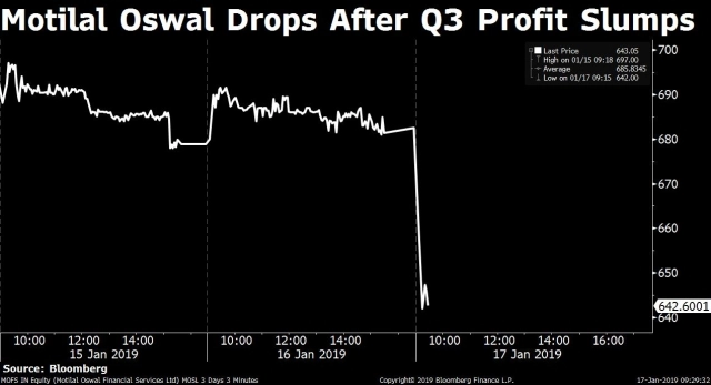 Shares of the brokerage firm slumped as much as 6.2 percent, the most since Oct. 31, to Rs 640 on the back of its third quarter results.