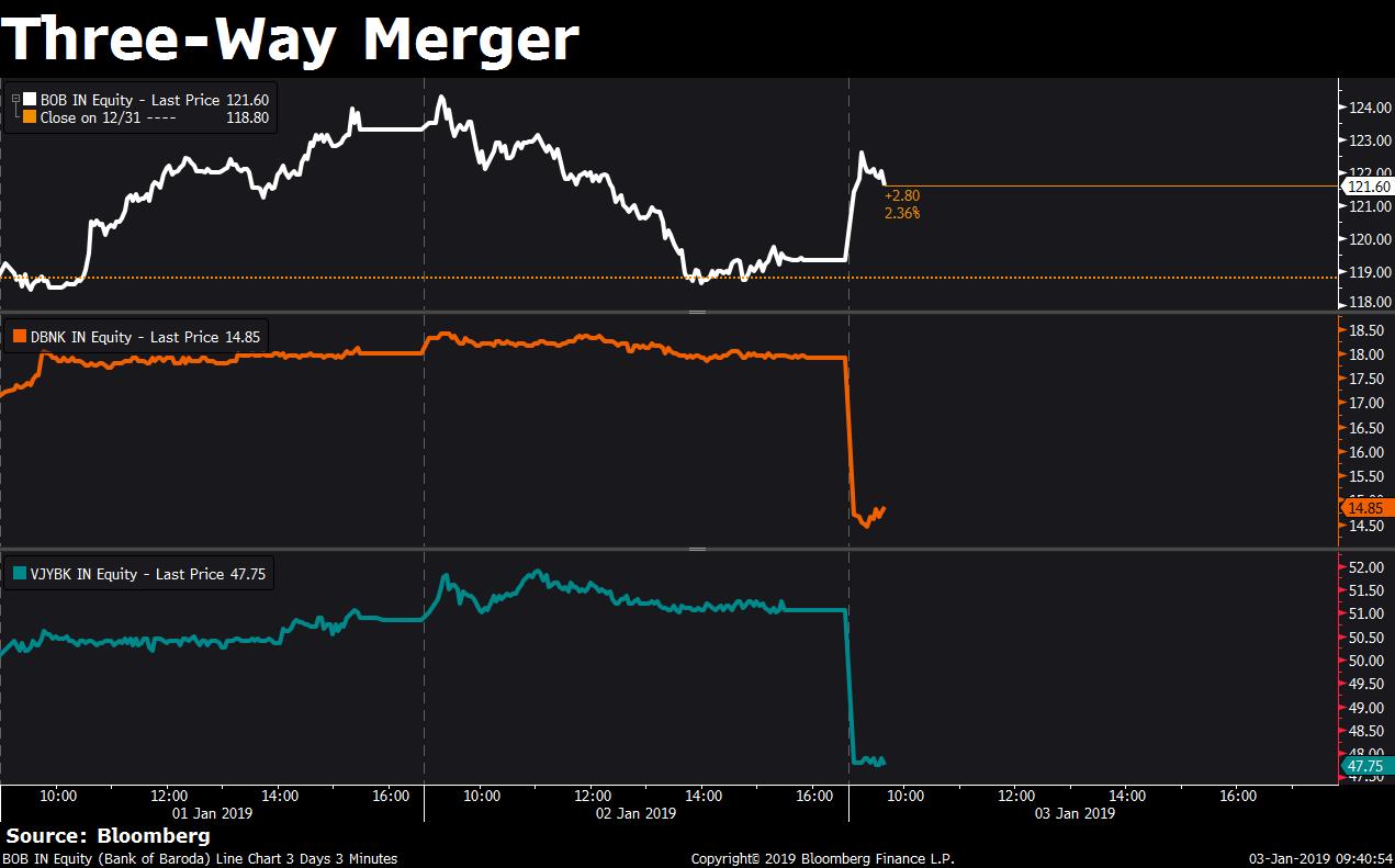 Shares of Bank of Baroda rose, while Dena Bank and Vijaya Bank declined after the Union cabinet approved the three-way merger of the state-run lenders. The banks then announced the share swap ratios for the transaction.
