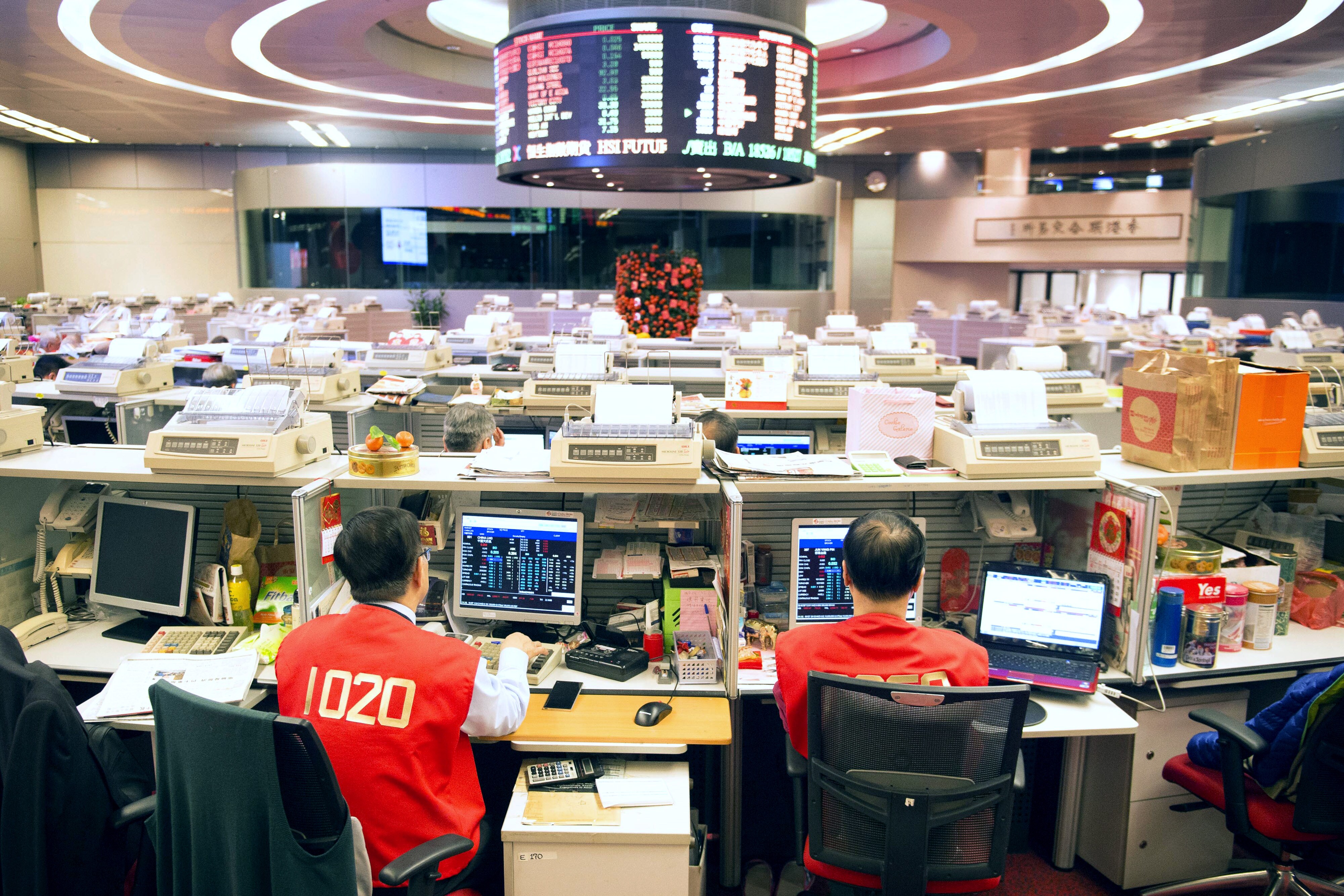 Traders work on the trading floor of the Hong Kong Stock Exchange, operated by Hong Kong Exchanges and Clearing Ltd. (HKEx), during the first day of trading after lunar new year in Hong Kong, China (Photographer: Xaume Olleros/Bloomberg)