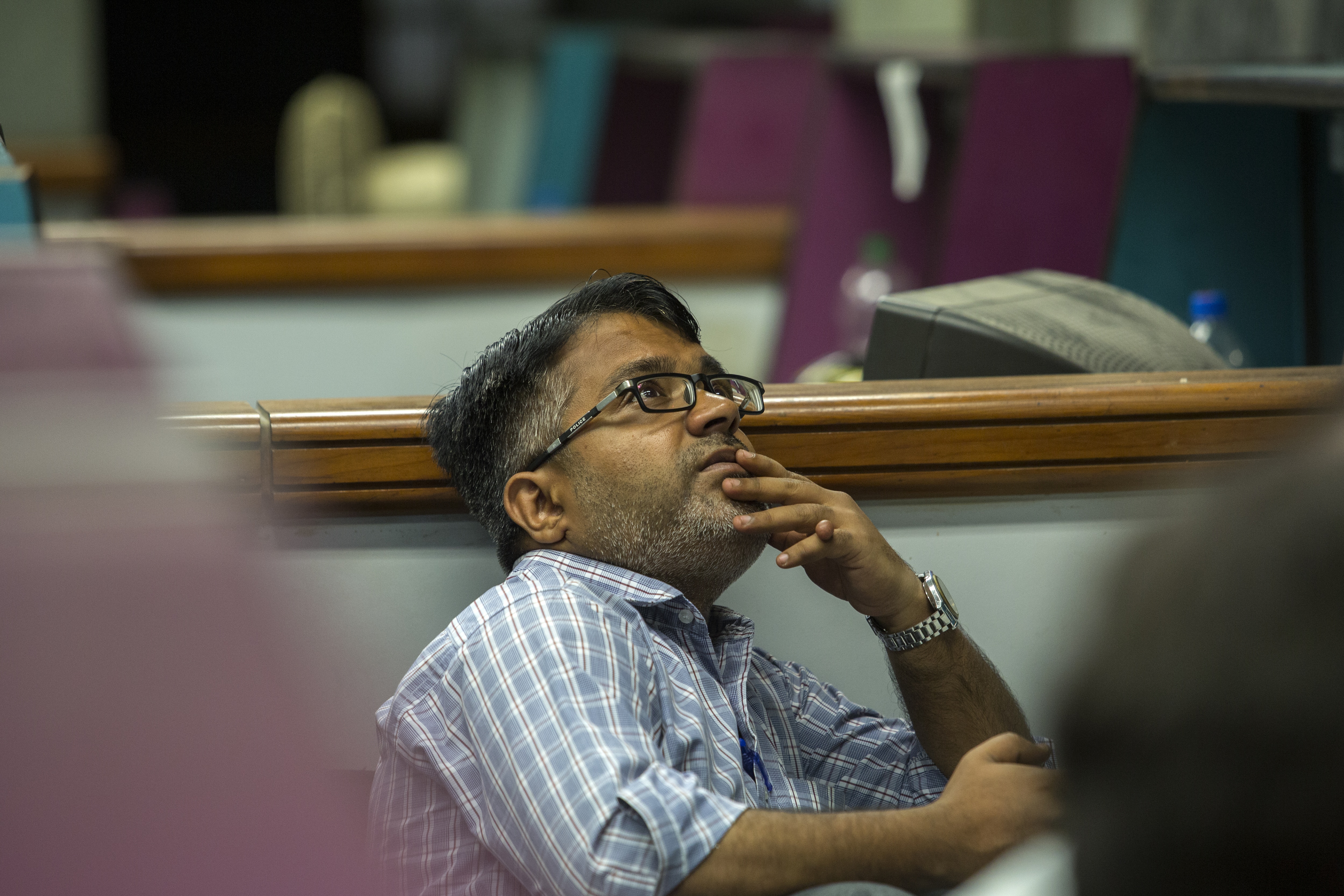 A trader looks up at an electronic screen displaying stock prices. (Photographer: Asim Hafeez/Bloomberg)