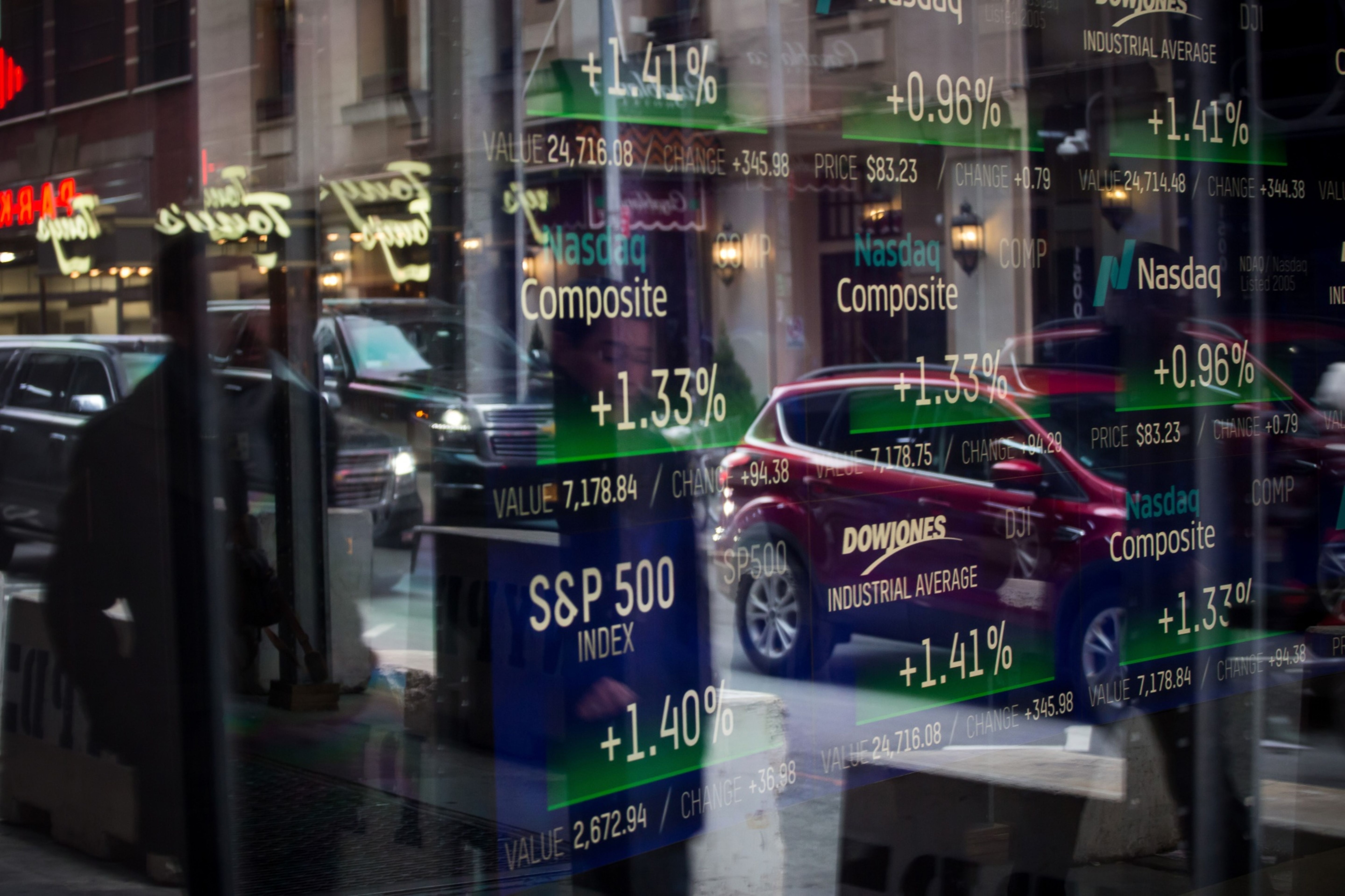 Monitors display stock market information at the Nasdaq MarketSite in New York, U.S.(Photographer: Michael Nagle/Bloomberg)