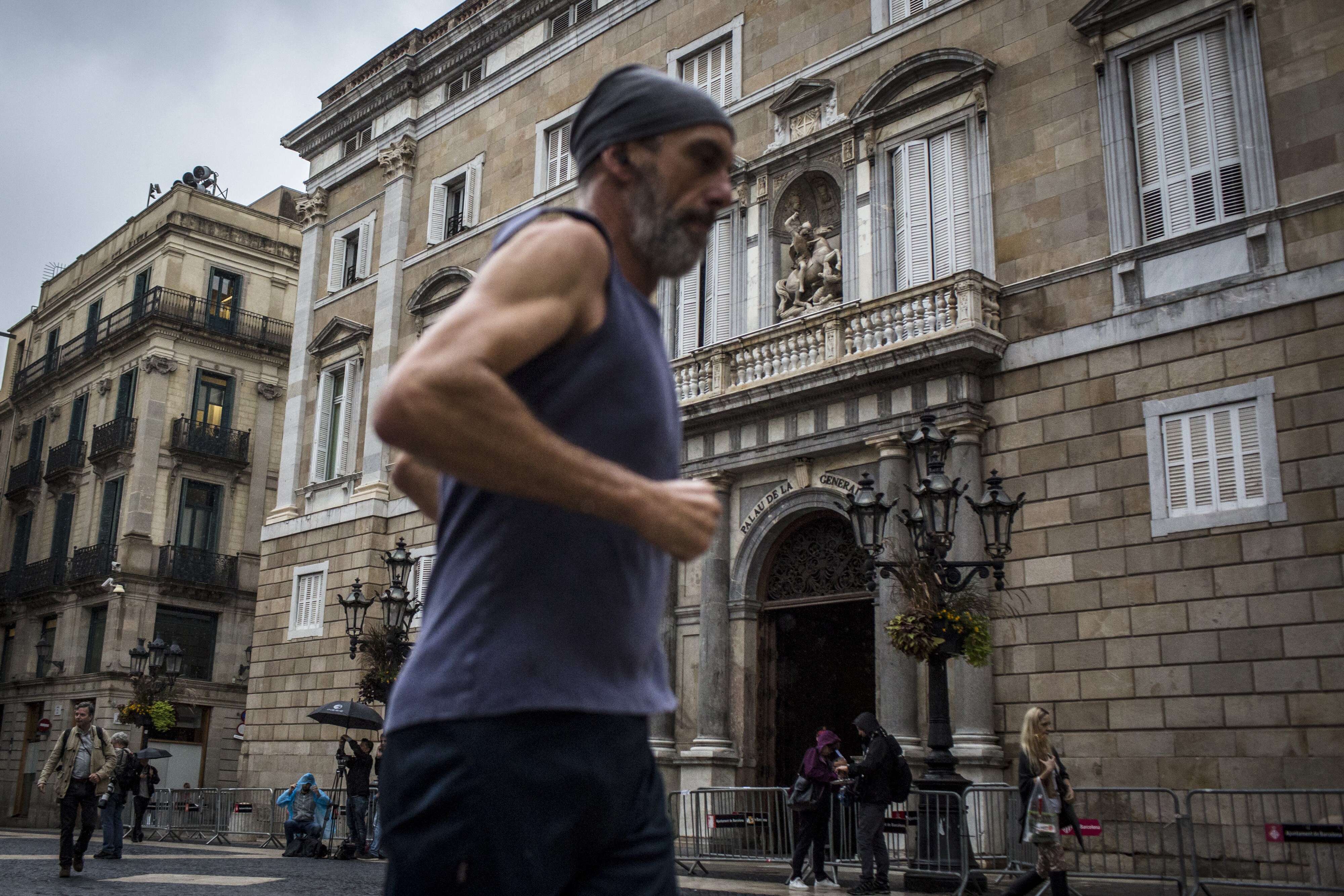 A man jogs past the entrance to the Generalitat regional government offices on Sant Jaume square in Barcelona, Spain. (Photographer: Angel Garcia/Bloomberg)