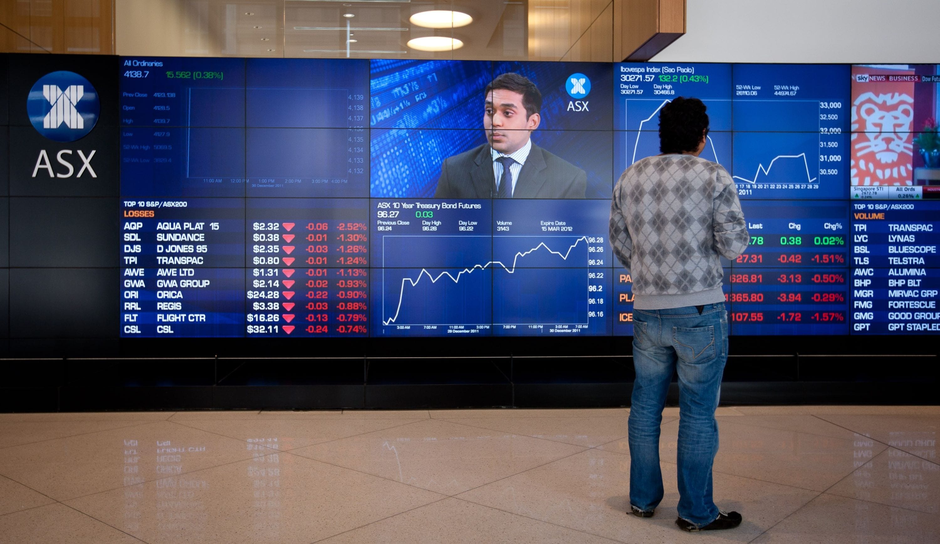 A man watches electronic stock boards at the Australian Securities Exchange (ASX Ltd.) headquarters in Sydney, Australia. (Photographer: Ian Waldie/Bloomberg)