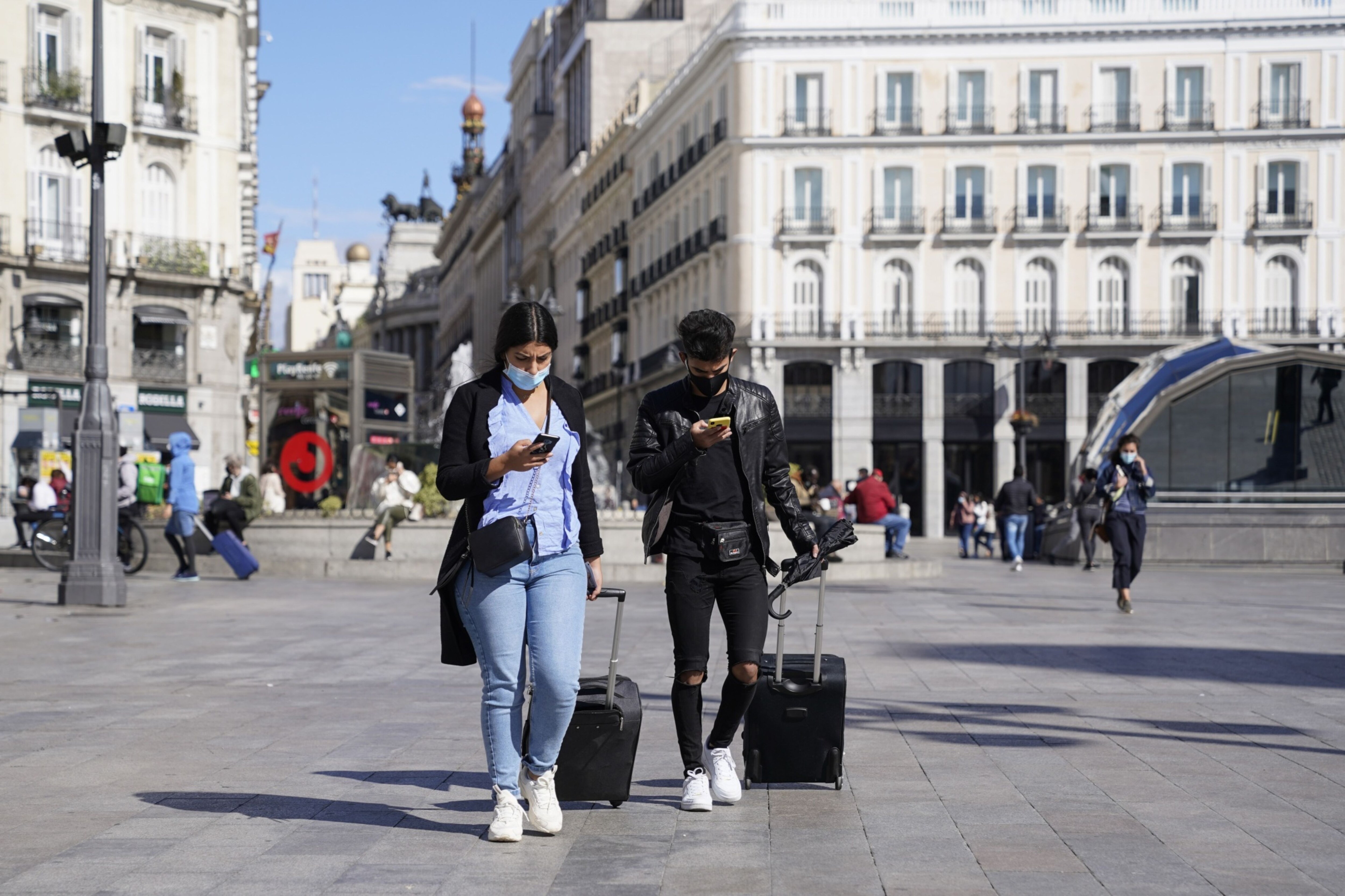 Pedestrians wearing protective masks carry suitcases while walking in Madrid, Spain. (Photographer: Paul Hanna/Bloomberg)