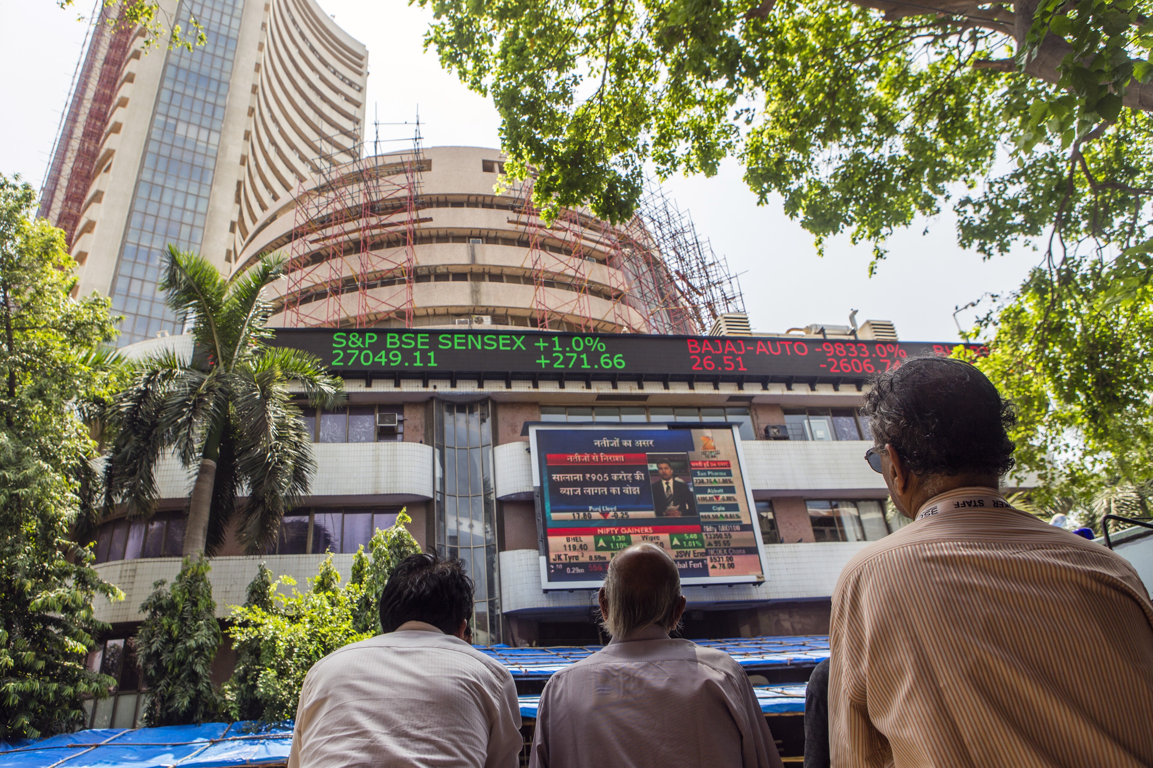 Men looks up at an electronic screen displaying stock figures at the Bombay Stock Exchange (BSE) in Mumbai, India (Photographer: Prashanth Vishwanathan/Bloomberg)