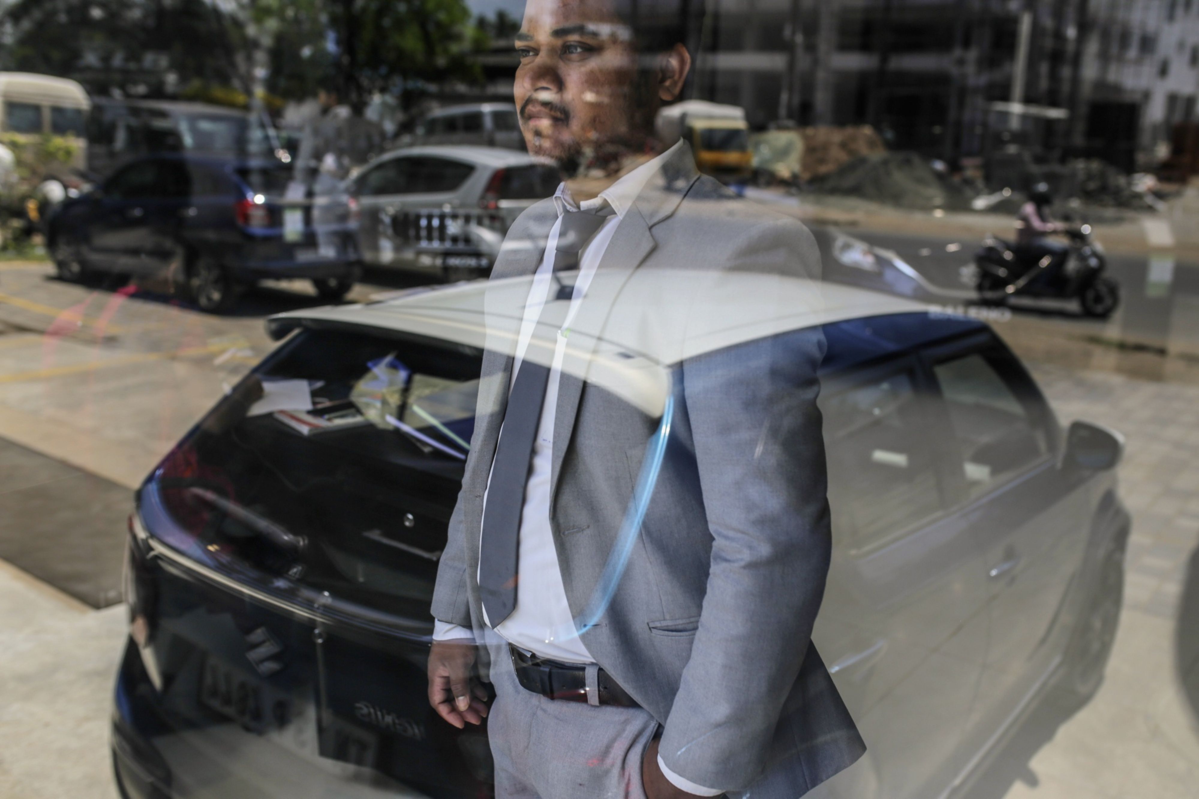 A person stands in the window of a car company's showroom in the Ambattur district in Chennai, India. (Photographer: Dhiraj Singh/Bloomberg)