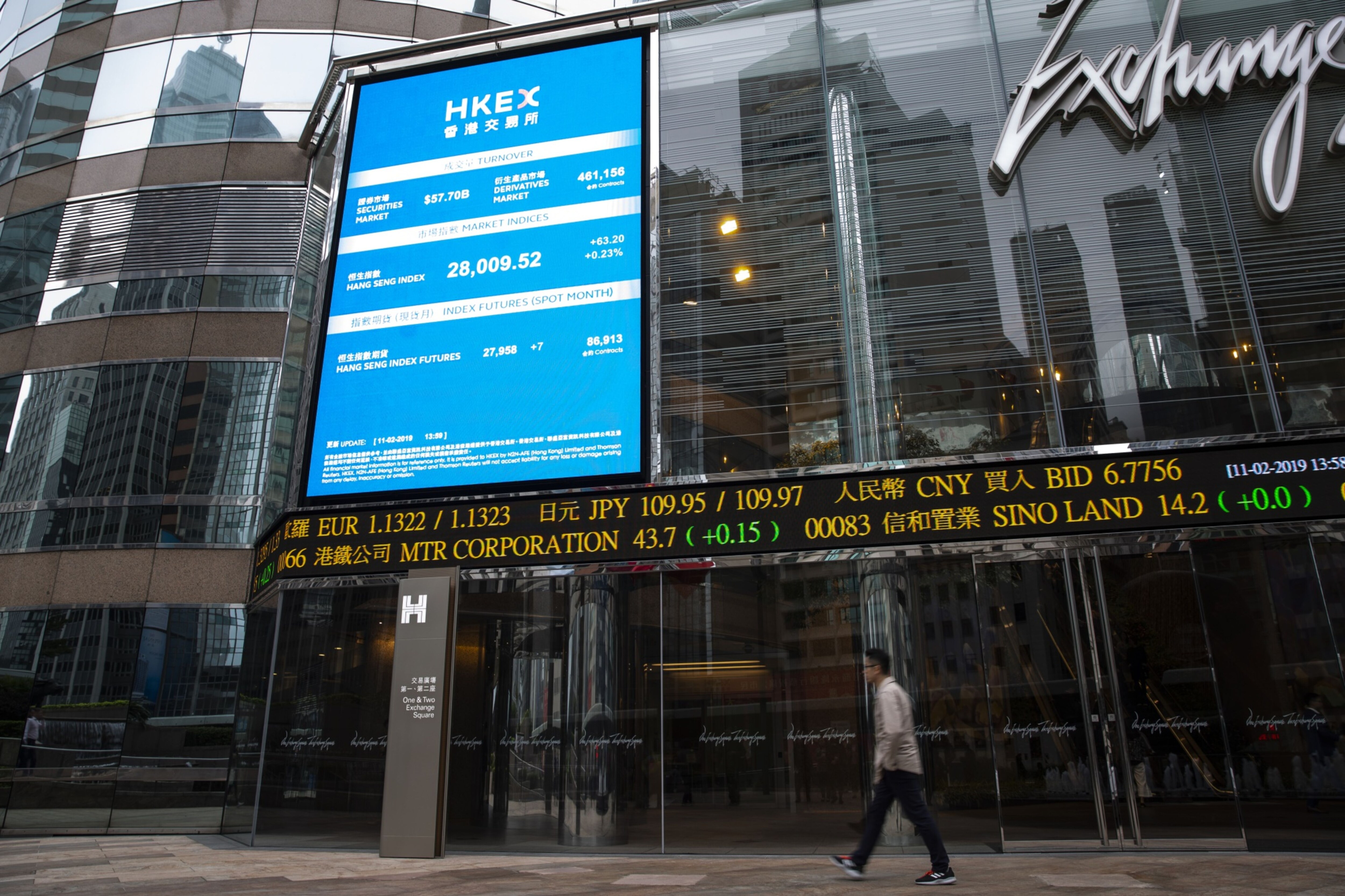 A pedestrian walks past an electronic ticker board and a screen displaying stock figures outside the Exchange Square complex, which houses the Hong Kong Stock Exchange, in Hong Kong, China. (Photographer: Justin Chin/Bloomberg)