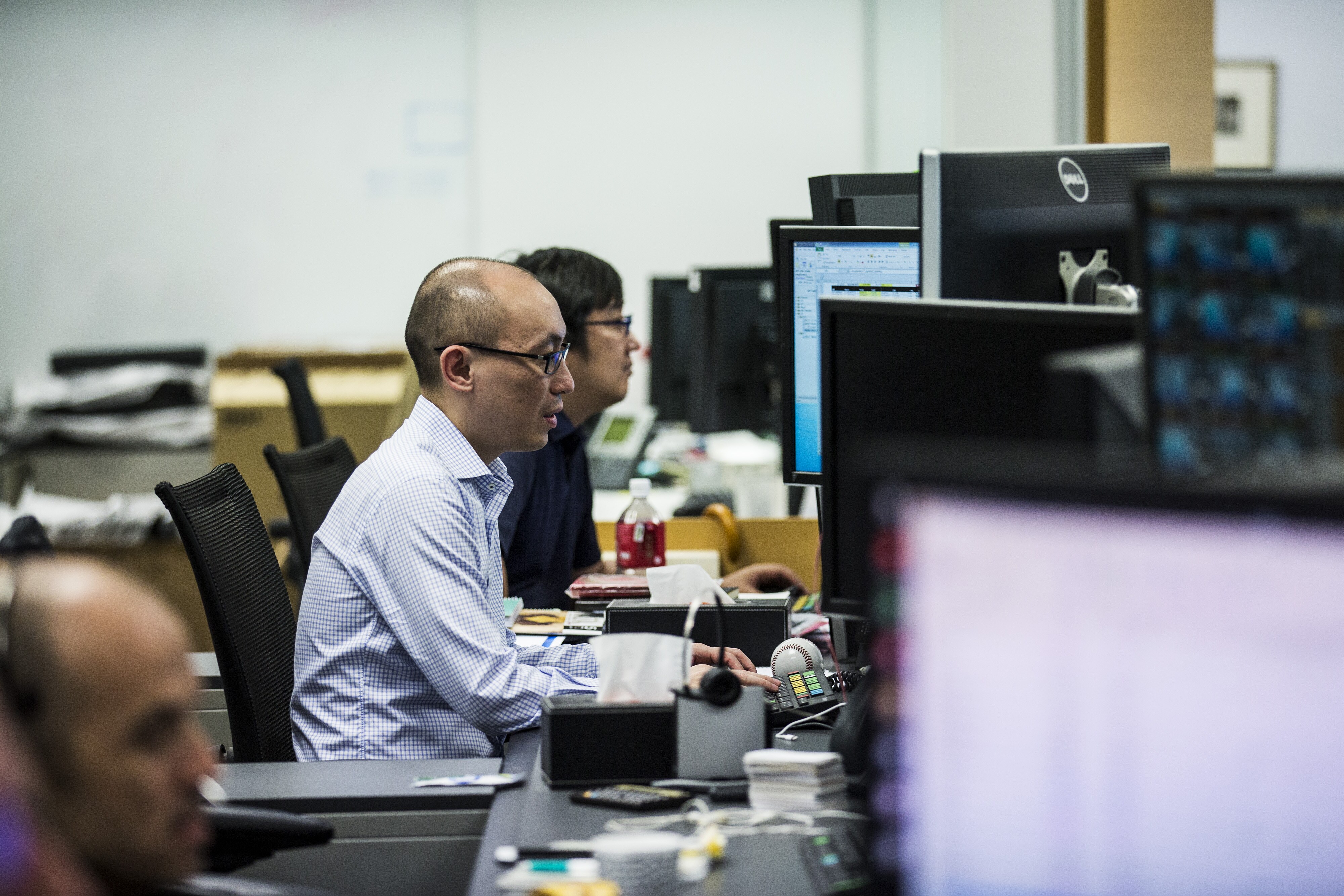 Traders work at the BFAM Partners Ltd. office in Hong Kong, China. (Photographer: Justin Chin/Bloomberg)