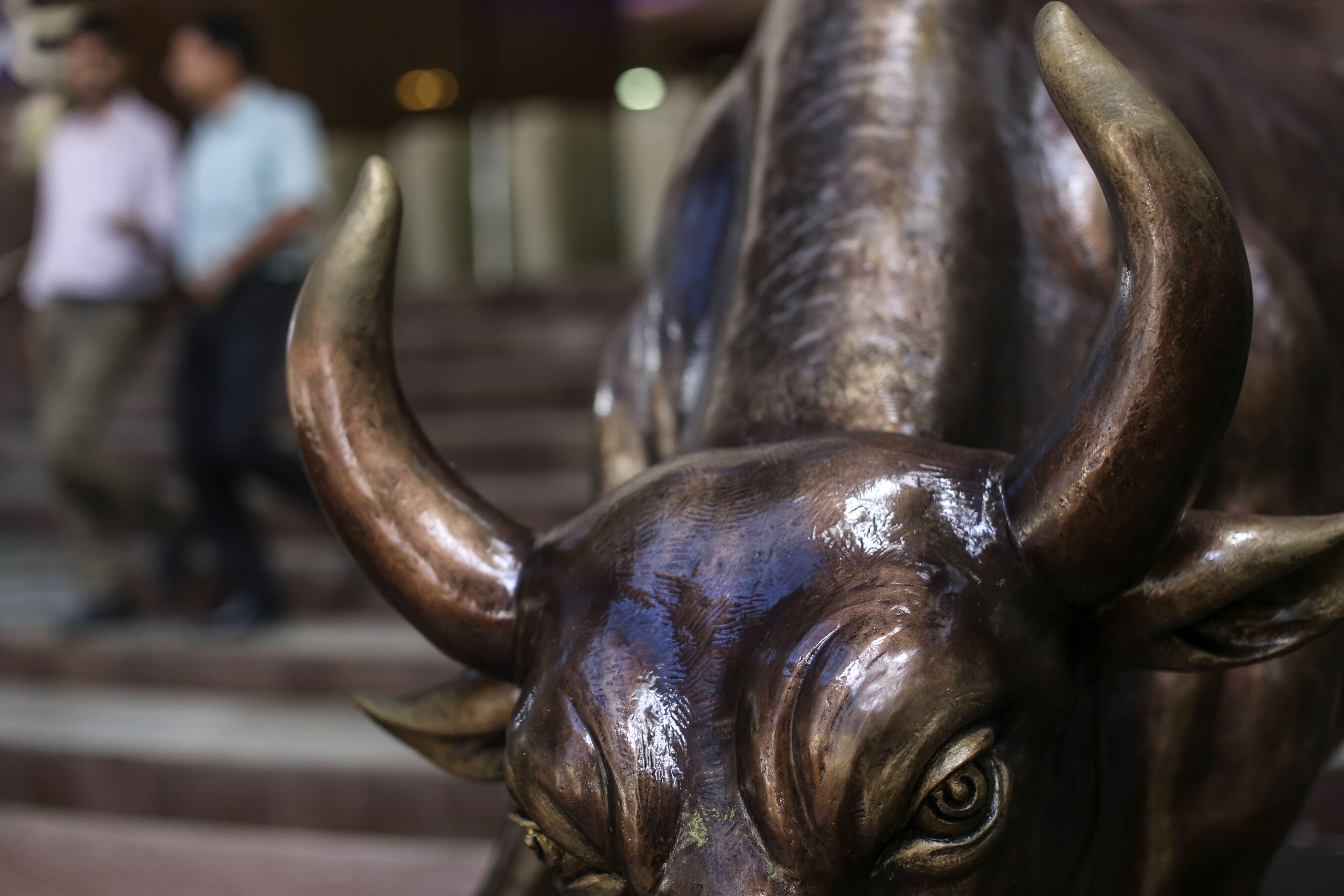A bronze bull statue stands at the entrance to the Bombay Stock Exchange building in Mumbai. (Photographer: Dhiraj Singh/Bloomberg)